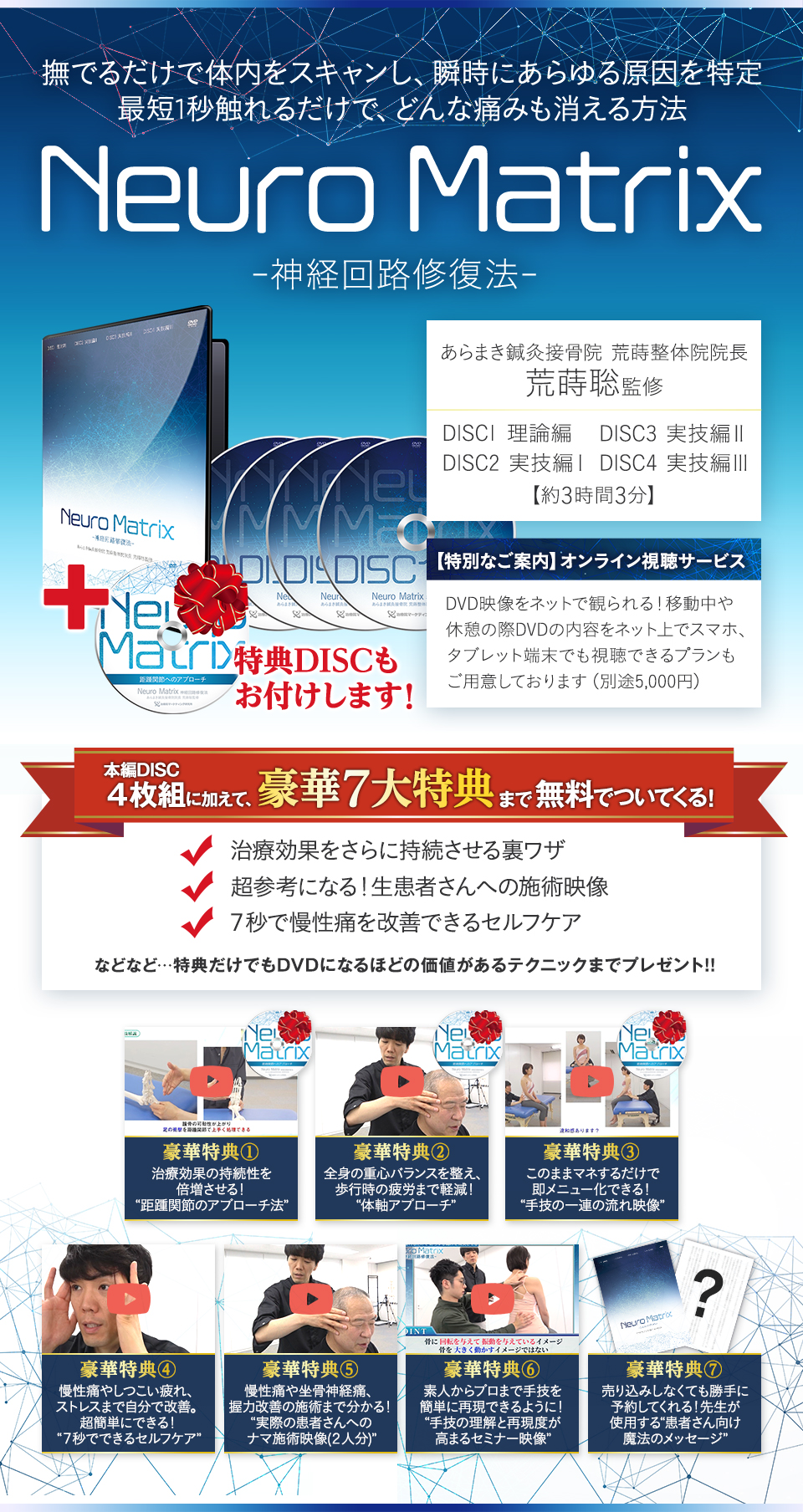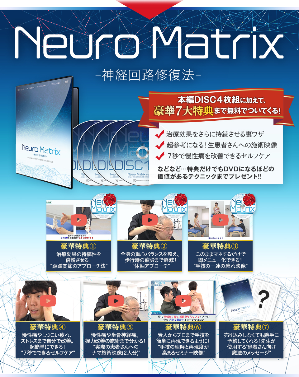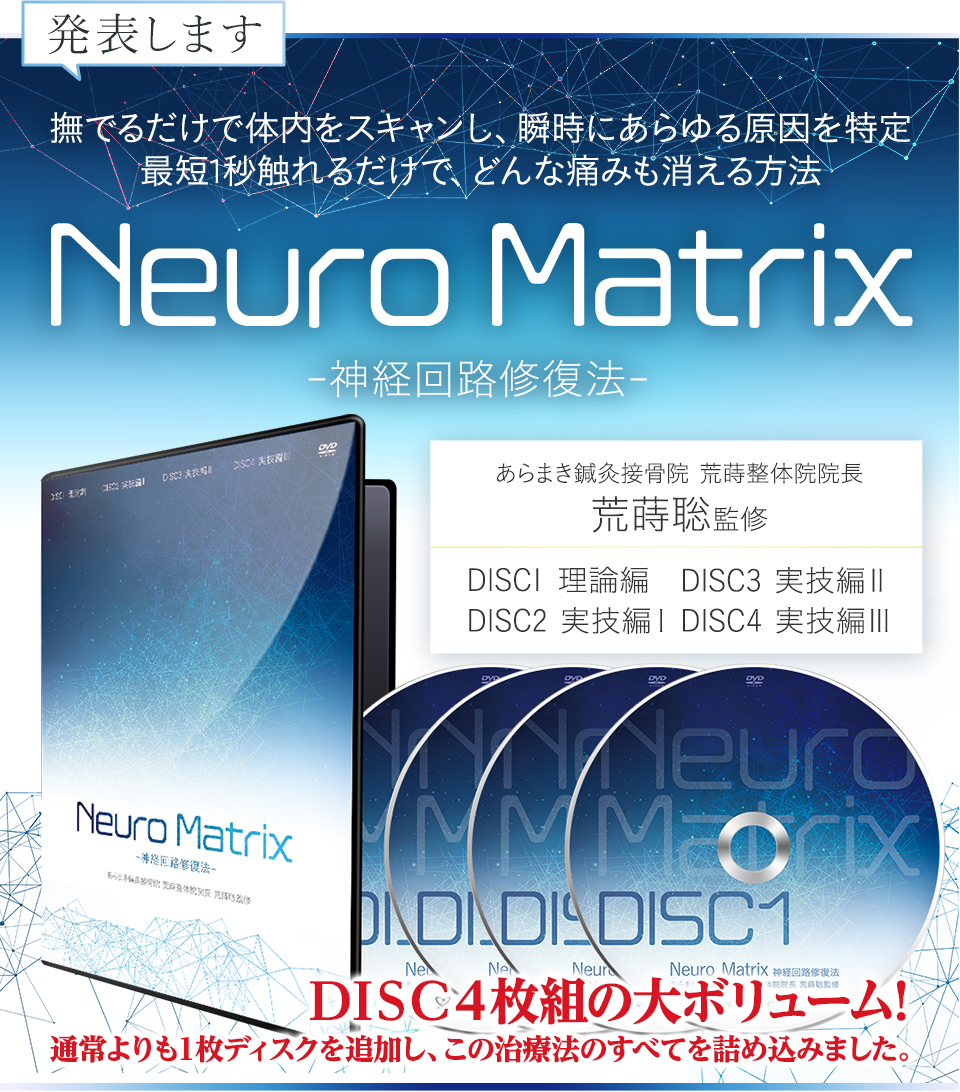 今回発表した「NeuroMatrix―神経回路修復法―」は、痛みの根本原因である神経サインを手技で上書きしてしまう前代未聞の手技が収録された、唯一のDVDです。