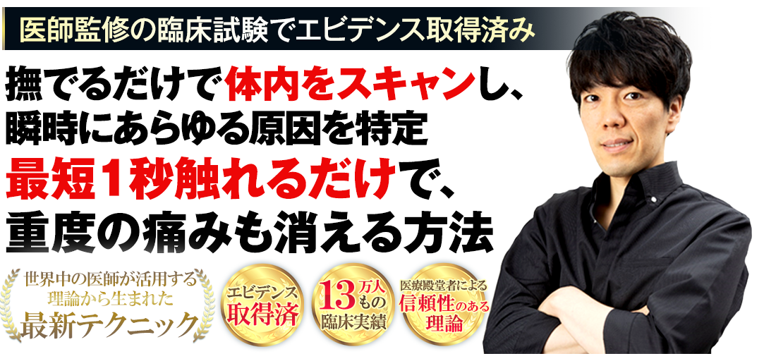 これからあなたにご紹介させていただくのは、撫でるだけで症状の原因をスキャンし、触れるだけで痛みを消失させることのできる、まさに前代未聞の手技になります。