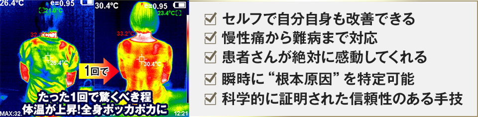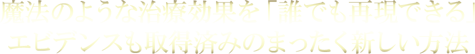 これまでご覧いただいたように、科学的エビデンスも取得し、科学でその効果が100%証明されているのがこの手技です。これは正直誇張でもなんでもなく、従来の手技を大きく超える結果を即出すことが出来るまさに魔法のような方法なのです。